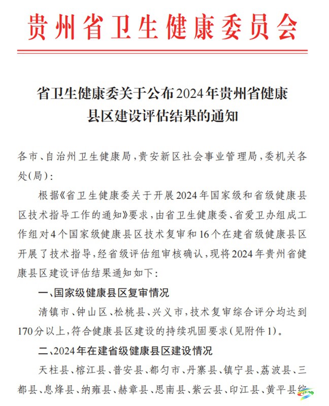 本网讯(县疾控中心任玲美)近日,贵州省卫生健康委员会公布了2024年贵州省健康县区技术评估结果,我县高分顺利通过国家健康县复评验收。五年来,县委、县政府始终以深入贯彻实施健康中国战略为核心,以加快建设幸福苗乡为
